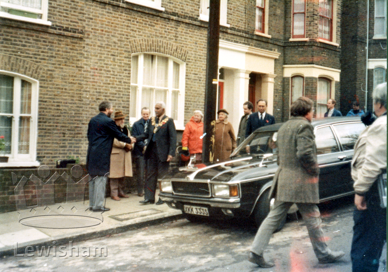 colour photograph showing people outside 16 Bolden Street for Thankfull Standee plaque ceremony 5/11/84