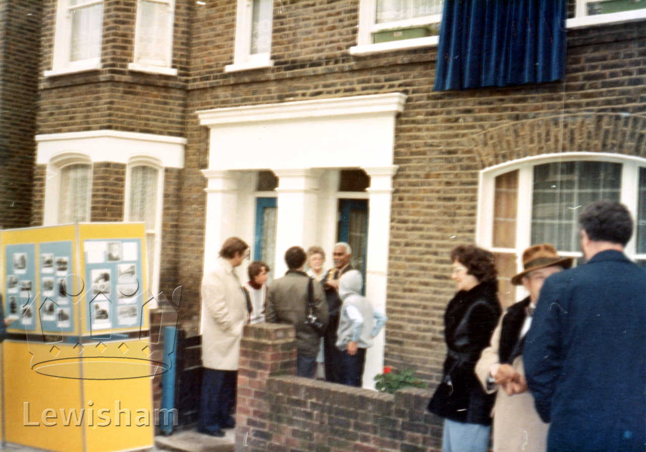 colour photograph showing Thankfull Sturdee plaque ceremony outside 16 Bolden Street SE8 5/11/84