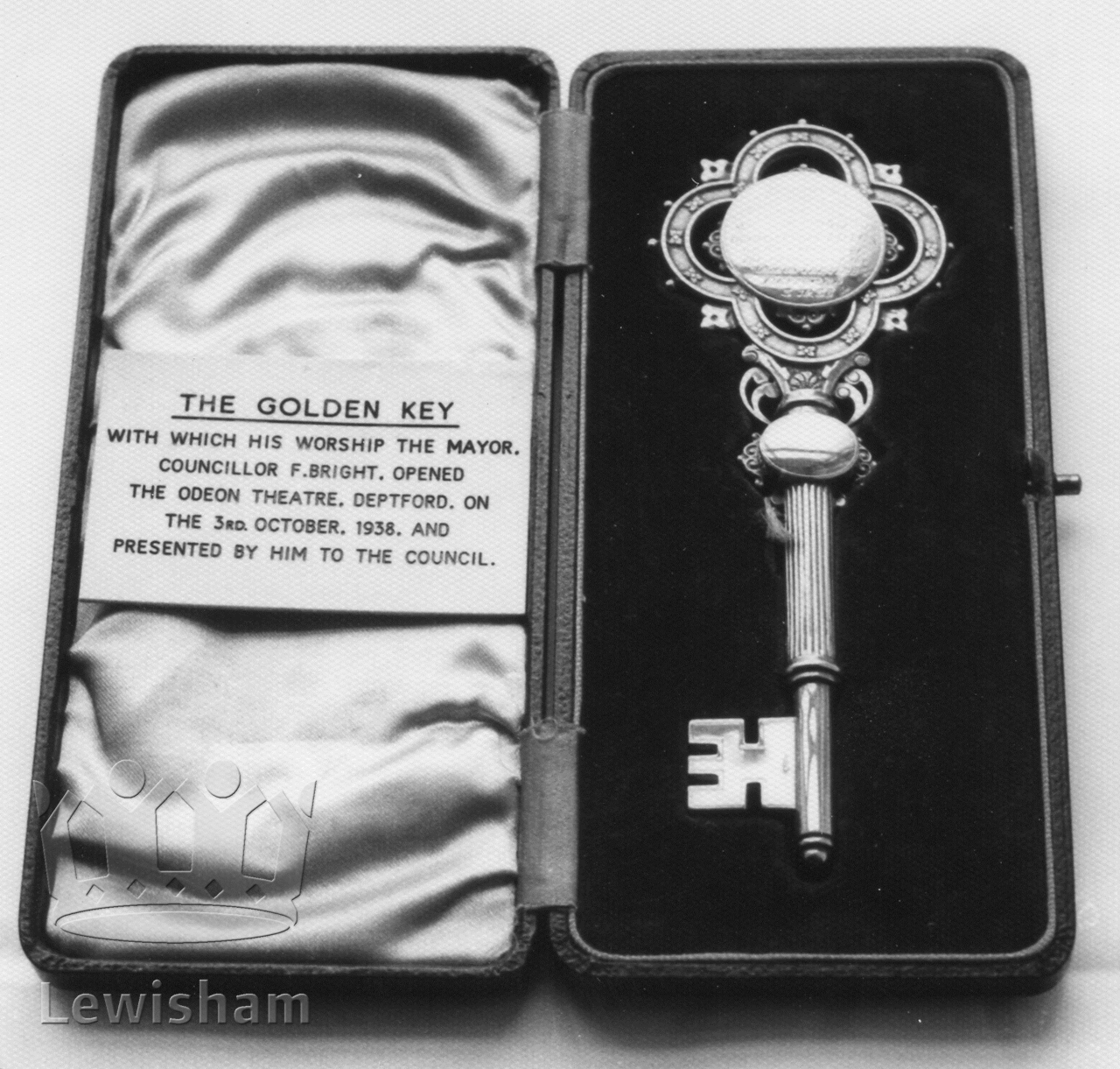 Black and White photograph showing the golden key with which the Mayor, Councillor F Bright, opened the Odeon Theatre, Deptford, on 3rd October1938.