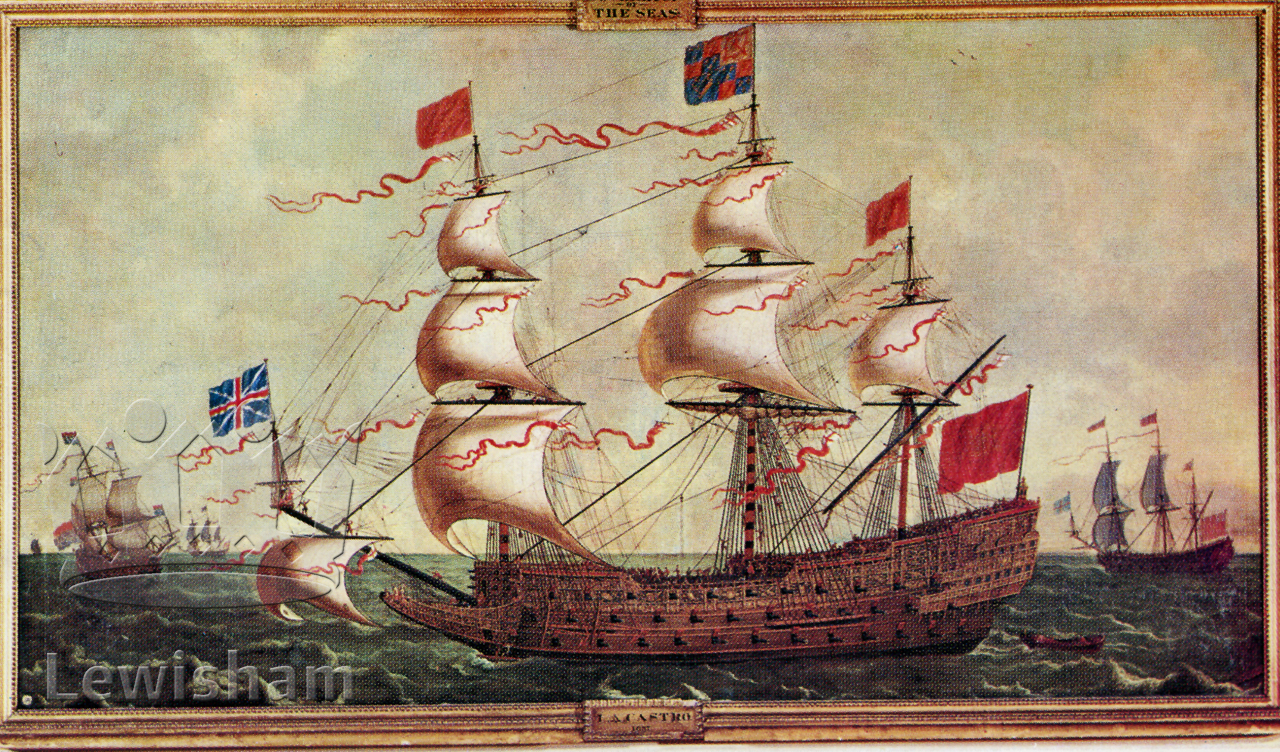 colour postcard of a painting of the 'Sovereign of the Seas', by L. A. Castro, at Parham Park, Sussex