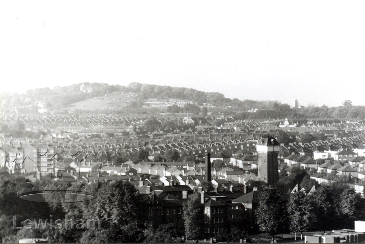 Black and White photo of the view from Lewisham Park flats looking towards Honor Oak, showing Ladywell Lodge 19/10/1968