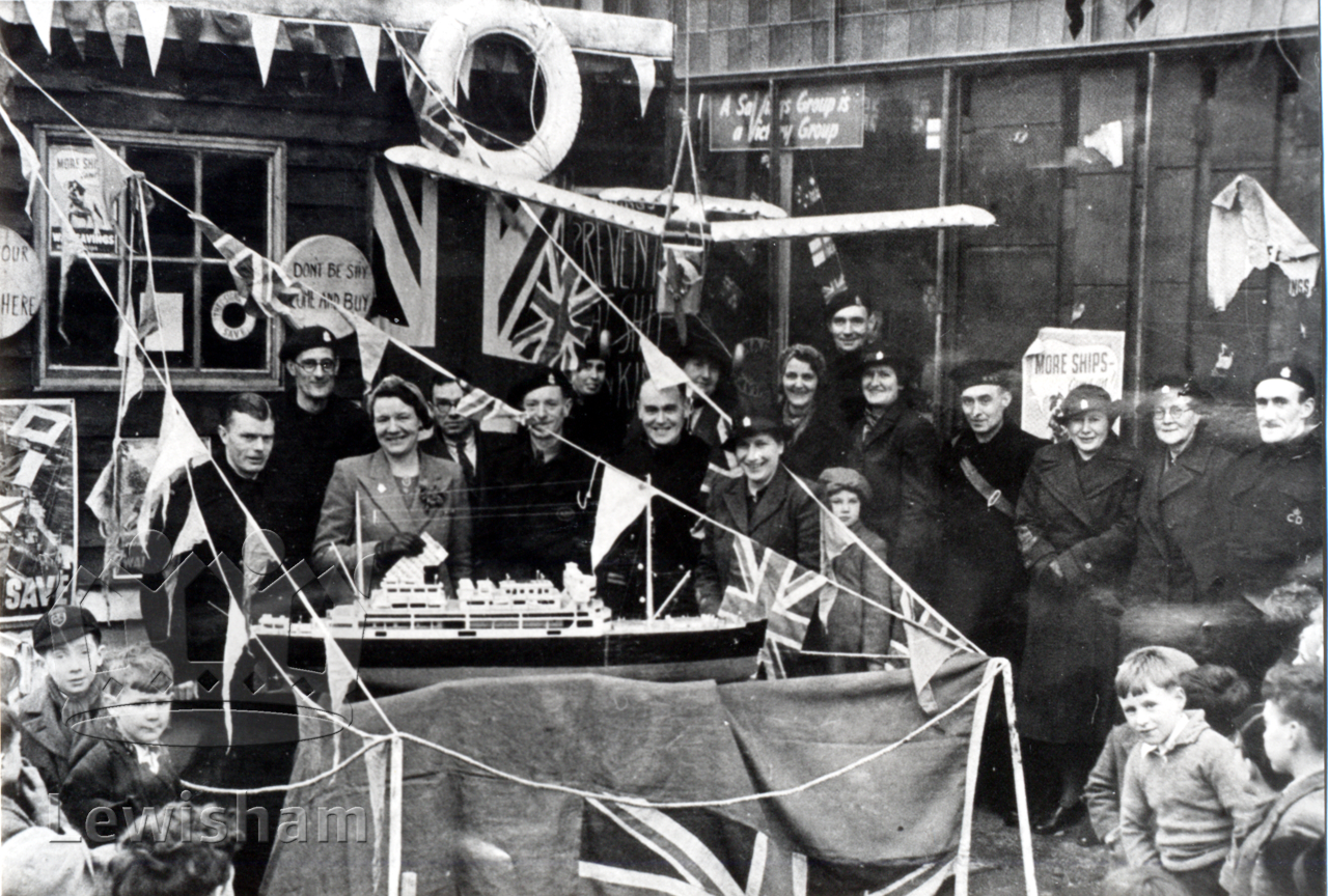 W.V.S at their Grove Park post during Warships Week, date unknown. Model of a boat on display Union Flags.
