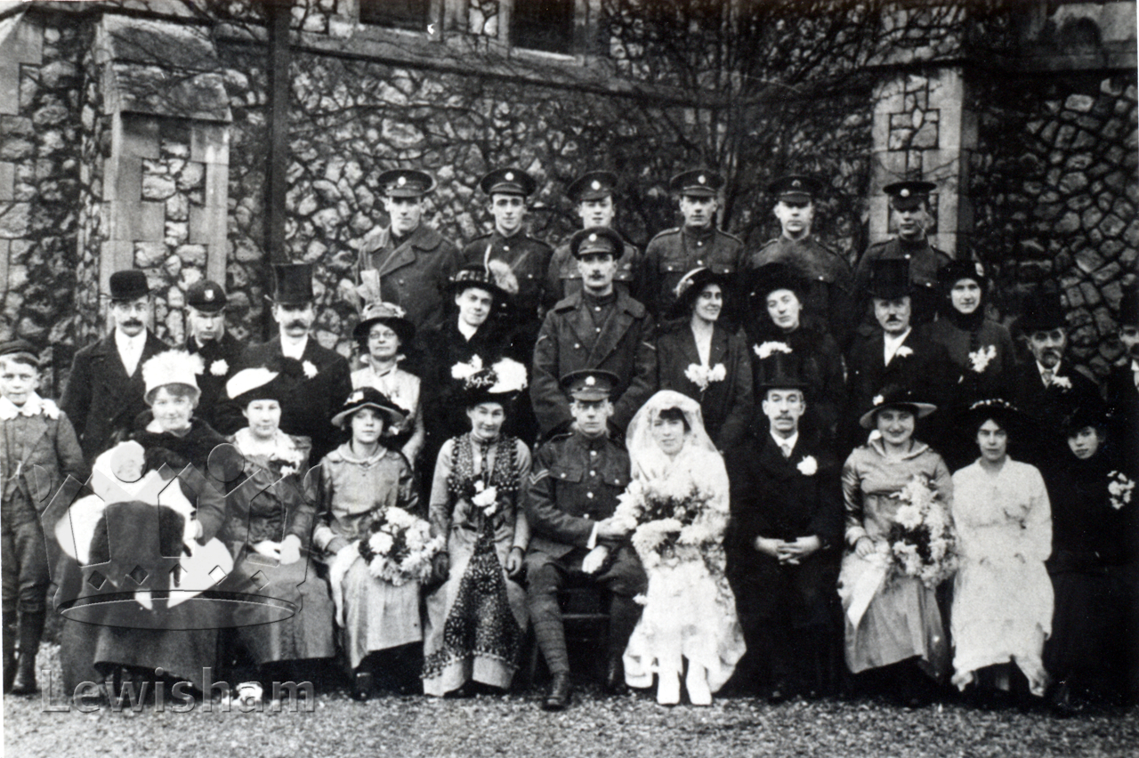 Black and White photo of the wedding on Christmas Day of Corp. Frederick Charles Fox of the Army Service Corps, Motor Transport Company and Victorine Maud Ball at St. Augustine's Church, 25/12/1916