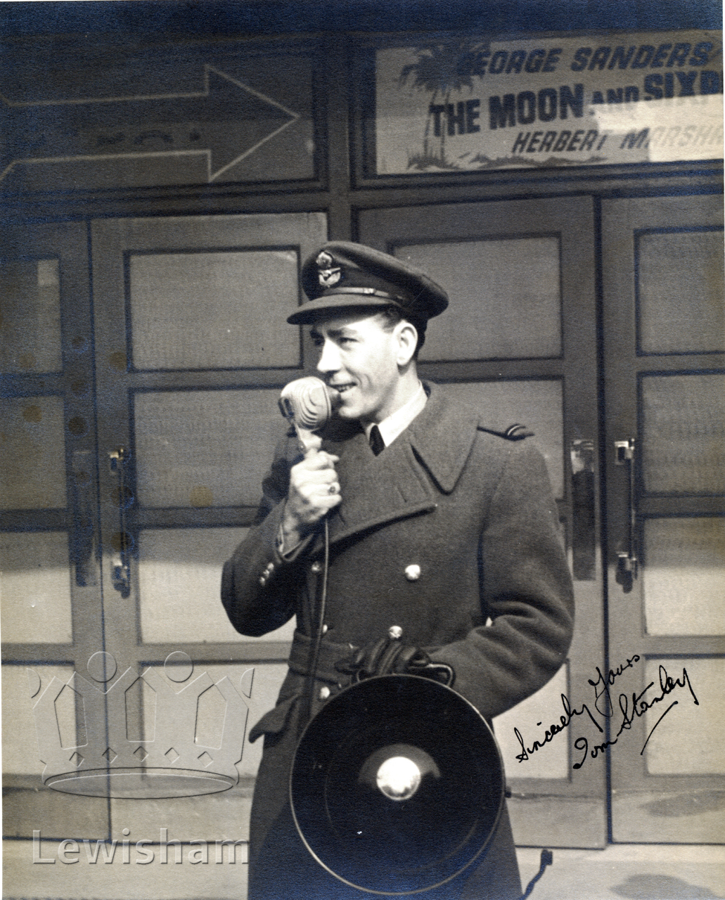 Flying Officer Stanley broadcasting outside the 'Odeon'. Flight Lieut. Stanley was a pupil of Monson Road School, New Cross, and later lived in Catford. He took part in many bombing raids and was awarded the D.F.C. This picture shows him broadcasting outside Deptford deon during 'Wings For Victory'. Later in the same year Flight Lieut. Stanley was reported missing.