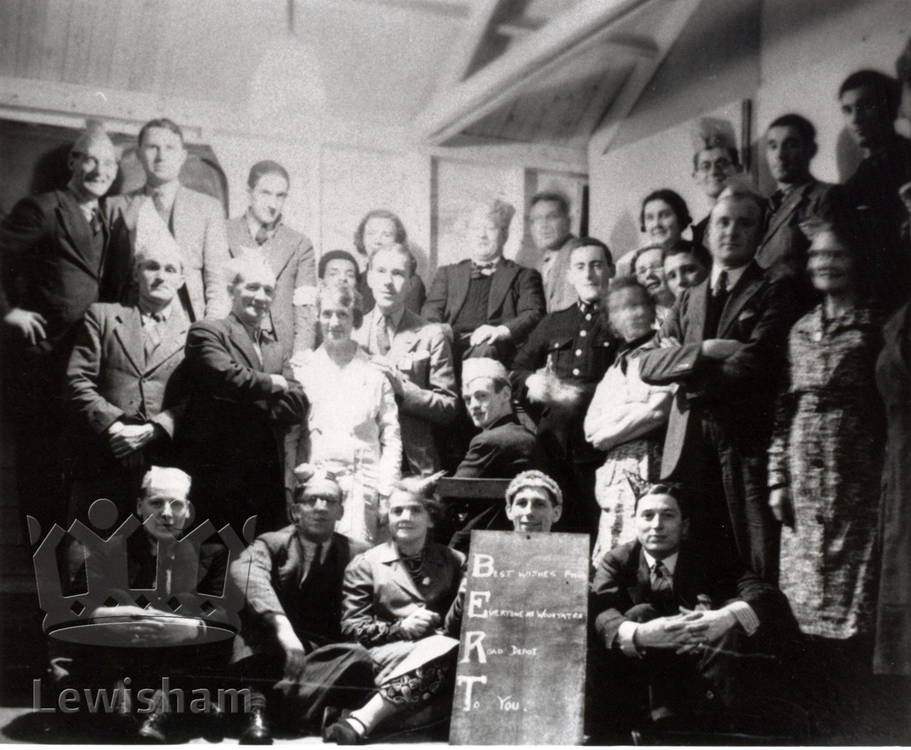 Group of people holding a sign saying "Best wishes from Everyone at Woodyates Road Depot To You." (BERT)
